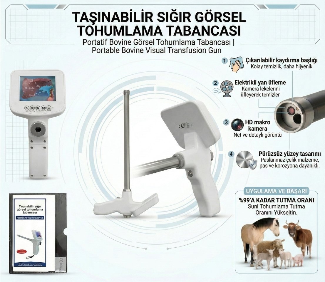 Büyükbaş hayvancılık için özel olarak geliştirilmiş bu taşınabilir görüntülü tohumlama cihazı, saha koşullarında profesyonel uygulama sunar. HD kamera ile rahim içini gerçek zamanlı görüntüleyerek körlemesine yapılan geleneksel yöntemlerin yerini alır. Servikal geçişi görsel olarak takip etmek; hem başarı oranını artırır hem de uygulama süresini kısaltır.